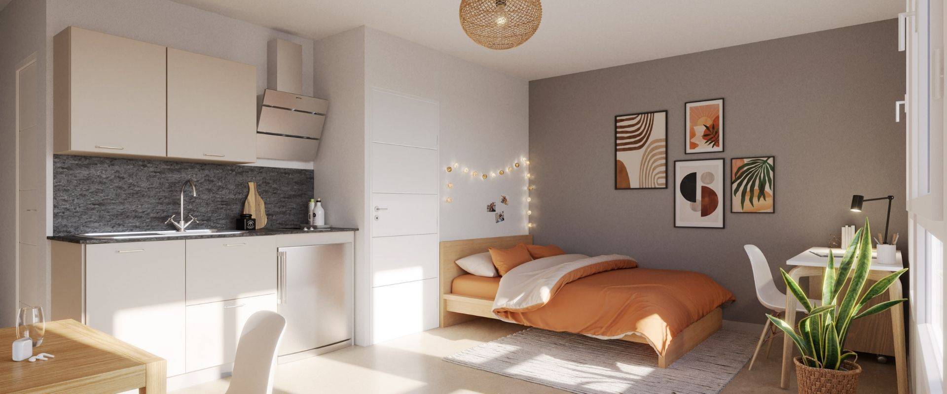 La résidence All Suites propose des studios entièrement équipés dotés d’une salle d’eau individuelle avec WC, d’un espace bureau avec rangements et d’un mobilier moderne. Les étudiants et jeunes actifs bénéficient de très nombreux services à l’intérieur de la résidence pour faciliter leur quotidien : une laverie, un espace de coworking, une cuisine collaborative et un espace de gaming-TV, etc.
